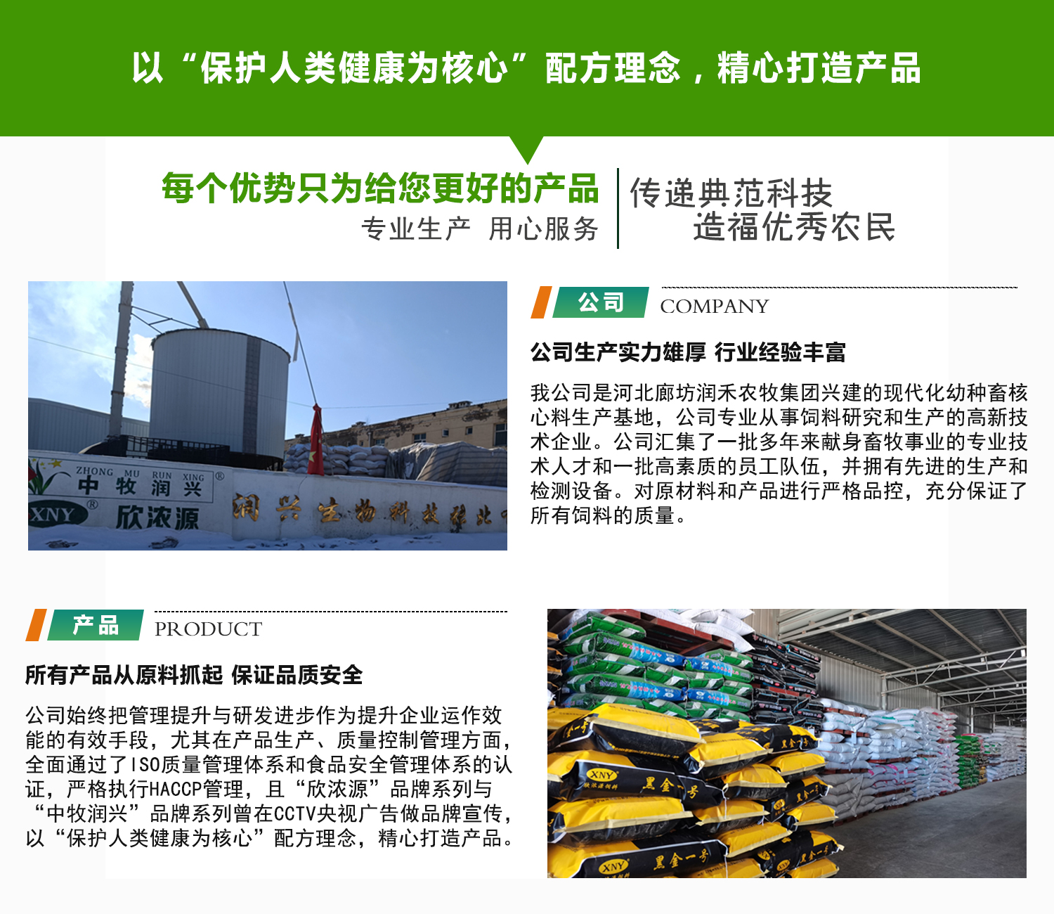 公司始终把管理提升与研发进步作为提升企业运作效能的有效方式,尤其在产品生产、质量控制管理方面,产品通过了ISO质量管理体系和食品安全管理体系的认证,严格执行HACCP管理,且“欣浓源”品牌系列与“中牧润兴”品牌系列荣登CCTV央视广告,做品牌宣传,获得了广大客户的一致认可,公司始终以“保护人类健康为核心”的配方理念,精心打造好产品。